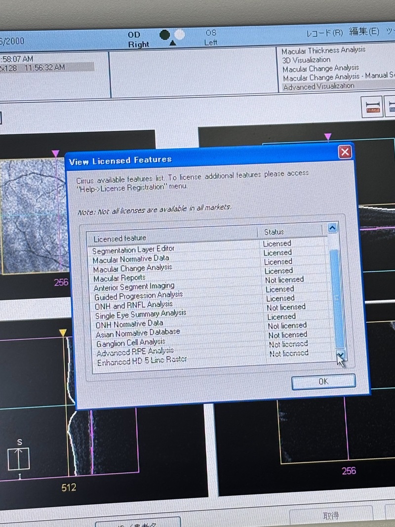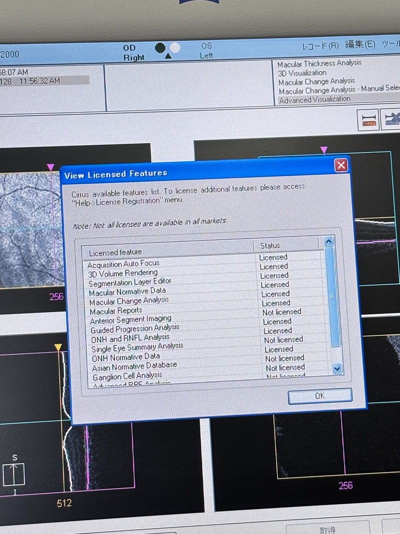 *Cirrus 400 OCT / Dual Core processor Licensed : Acquisition Auto Focus, 3D Volume Rendering, Segmentation Layer Editor, Macular Normative Data,Macular Change Analysis, Macular Reports, Guided Progression Analysis, ONH and RNFL Analysis,ONH Normative Data, NOT Licensed : Anterior Segment Imaging, Single Eye Summary Analysis, Asian Normative Database,Ganglion Cell Analysis, Advanced RPE Analysis, Enhanced HD 5 Line Raster.