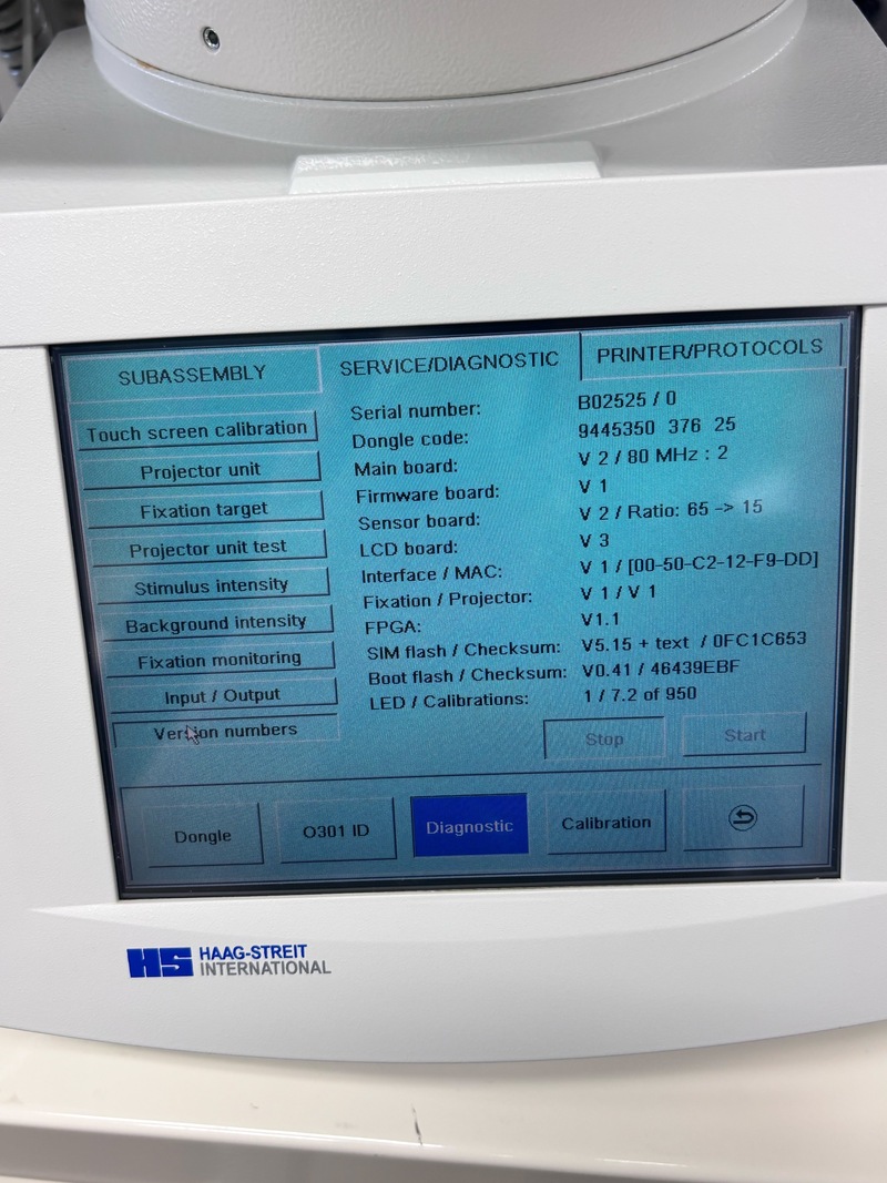 Octopus 301 Is a direct projection perimeter for examinations of the central visual field (30degree projection). It is a stand-alone system with the examination and control units integrated into the instrument. Color LCD input screen Ongoing counting of examinations Infrared sensitive eye camera and video display Perimeter automatically adjust for fixation loss Continuous average pupil size measurement Examination programs G1,32, M2, ST, and LVC Test Strategies – normal 4-2-1db, low vision, Dynamic and 2LT(Qualitative 3-zone) strategy Stimulus sizes- Goldman III and V Stimulus Intensity – 0-4800 asb Background illumination – 31.4 / 314 asb