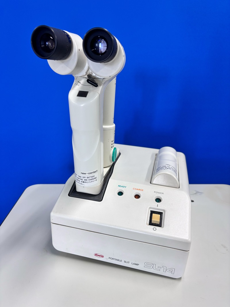 The Kowa SL-15 is a highly portable, cordless, handheld slit lamp used by eye care professionals for ophthalmic examinations, featuring 10x/16x magnification, adjustable slit widths, spot illumination, a blue filter, and optional digital camera connectivity, making it ideal for domiciliary visits, emergencies, and quick room changes due to its lightweight design and rechargeable battery with a charging stand.