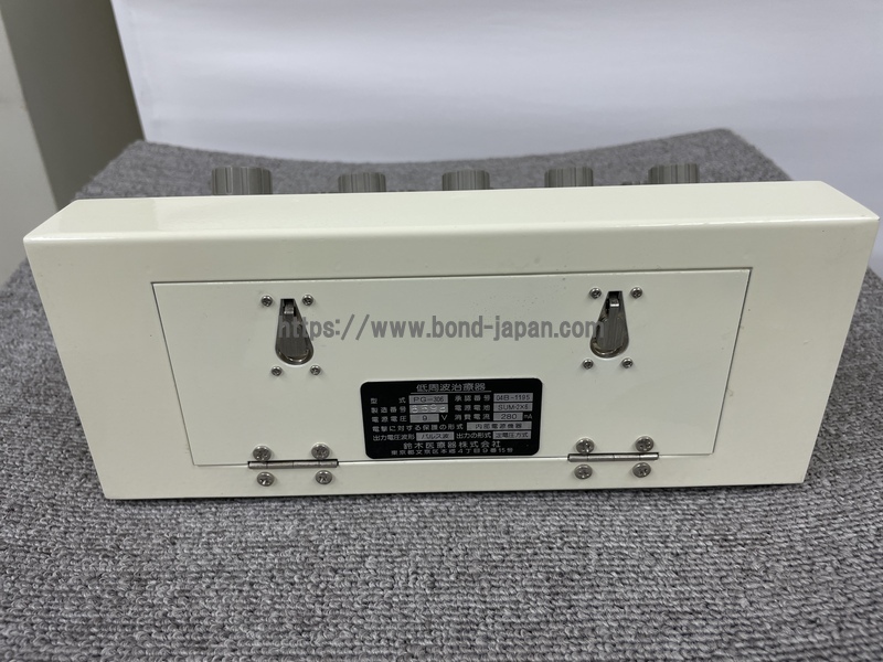 電源 DC9V 単2×6本 消費電力 280㎃ 発振周波数 LOW FREQUENCY 1.2.4.8Hz       HIGH FREQUENCY 15.30.60.120Hz タイマー 30分アナログタイマー 治療波形 パルス波 出力端子 6チャンネル 出力切替 強弱2段切替 通電方式 連続通電      間隔通電 通電時間2秒 休止時間2秒      ミックス通電(疎密通電)LOW+HIGH任意設定 モニター 電源LED、周波数音、バッテリーチェック 安全装置 零電位スタート方式・過電圧、過電流防止回路、誤操作表示 寸法 250×185×105㎜ 重量 2.3㎏