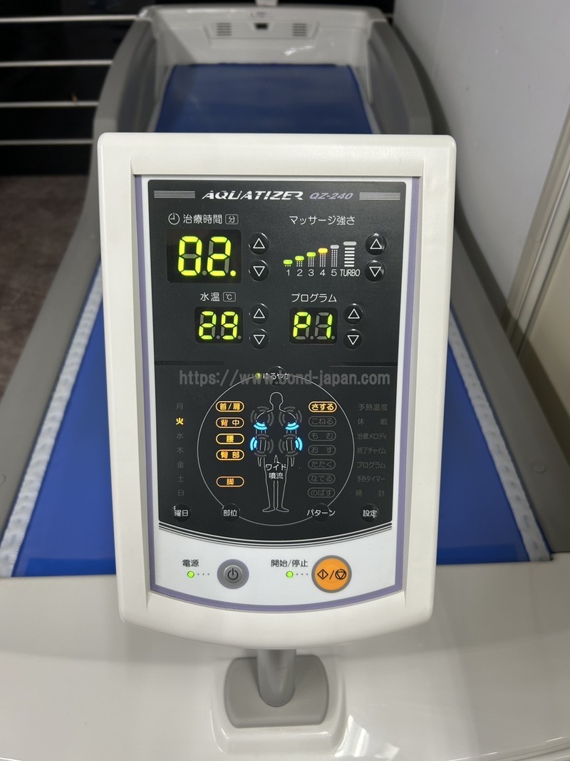 ■さまざまな好みにこたえる多彩なマッサージパターン ・7種類の手もみの技を再現:ノズルの移動スピードを調節する「可変速ノズル制御機能」により、きめ細やかなマッサージを再現し、リラクゼーションからダイナミックな刺激まで、幅広いマッサージが可能です。 ・マッサージモード:7種類のマッサージパターンに加えて「通常モード」「ゆるやかモード」を切り替えることにより、好みのマッサージモードを選択することができます。 ・6段階の強さが設定可能:マッサージの強さは、1~5段階に”TURBO"をプラスした6段階。柔らかなマッサージから強めのマッサージまで、患者様の状態に応じて強さが選べます。 ■治療バリエーションを拡大する切替機能付き2+2ノズル(ワイド噴流) 2+2ノズル(ワイド噴流)と2ノズルを切り替えることにより、“広範囲の治療”“必要な部位への集中的な治療”など、治療バリエーションが飛躍的に増大します。患者様一人ひとりの症状に合わせた治療を提供します。 ■マッサージパターンのプログラムが可能 全身、上半身中心、下半身中心、首、肩集中などのプリセットプログラム(8種類)に加え、ユーザー様が独自に作成できる最大10種類の「ユーザープログラム」を記憶し、豊富なプログラムの中から適した治療が選択できます。 ■静かな治療環境を保つ独自の静音設計 低騒音の「ミナト医科学専用」ポンプと新形状のノズルを採用し、ポンプ作動音と水流音を抑えました。さらに、ラジエータファンの機械作動音も低減。静かな治療環境を保ちます。 ■分かりやすく使いやすい操作パネル QZ-240が有する多彩な治療バリエーションやマッサージパターンは、LED表示による操作パネルで簡単に設定できます。