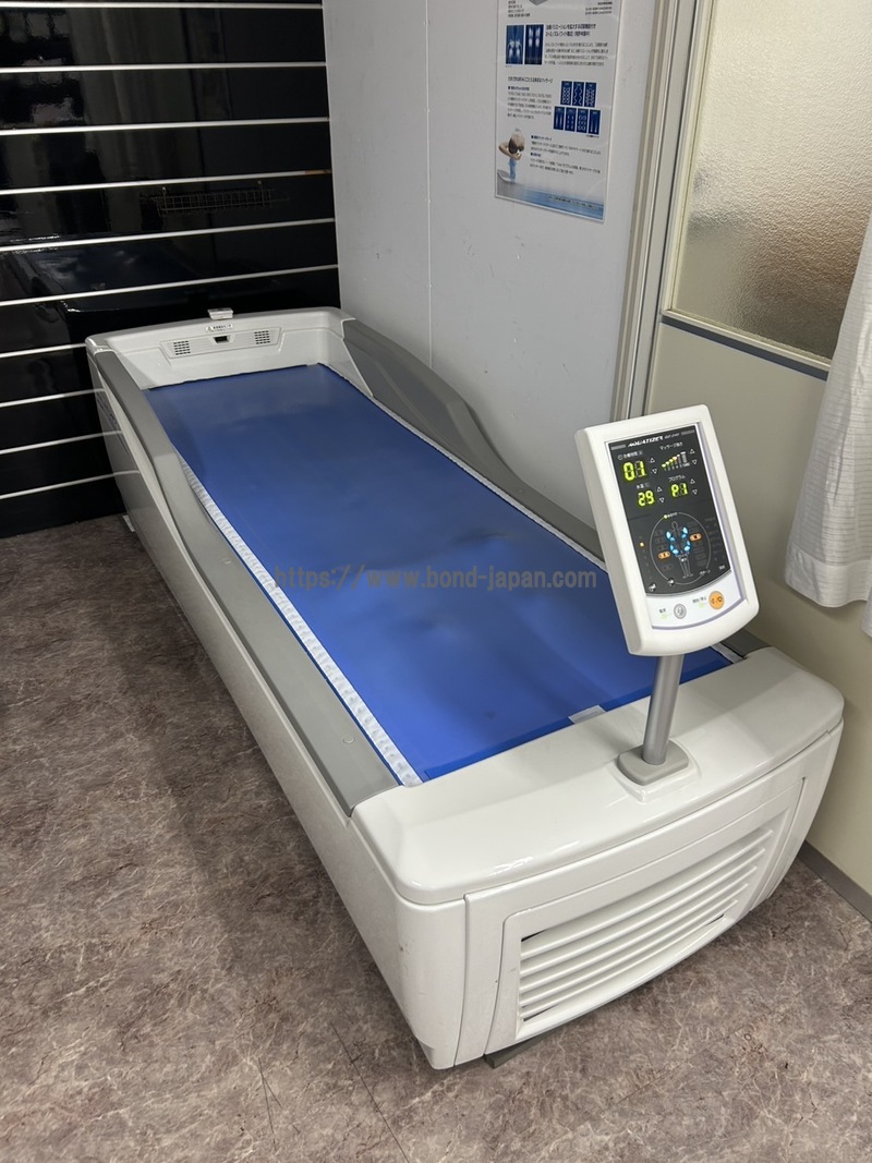 クラス分類:管理医療機器 特定保守管理医療機器 電撃保護:クラスⅠ機器 B形装着部 定格電源電圧及び周波数:単相200V 50/60Hz 電源入力:4,500VA 治療タイマ:1~99分 温度設定:25℃~40℃ その他の機能 ノイズ切り替え機能、身長自動設定機能、予熱週間タイマー、治療メロディ設定機能、 自動エア抜き機能、高温時作動制限機能、空冷機能、 足保持機能(オプション)、水冷機能(オプション) 電磁環境適合性:JIS T 0601-1-2:2002適合 マッサージ力の制限:ポンプ吐出力780kPa以下(JIS T 0601-2-205:20005適合) 寸法:長さ2,290×幅820×高さ1,075(mm) ベッドの高さ:500(mm) 水槽容量:220L